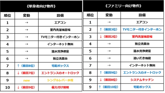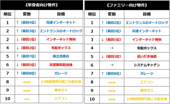 こちらのランキングでは昨年まで5年以上1位だった『インターネット無料』がランクダウンしております。昨今、SNSやネットゲーム、動画配信サービスの普及により、通信速度にもこだわりを持つ人が増えております。そういった背景から高速インターネットの需要が大きく増加しております。また24時間利用可能ごみ置き場が初のランクインとなっており、生活利便性を求める方が増えています。都市ガスに関しては、生活コストを少しでも抑えるためにLPガス物件が敬遠される傾向が増しているとも言えるでしょう。